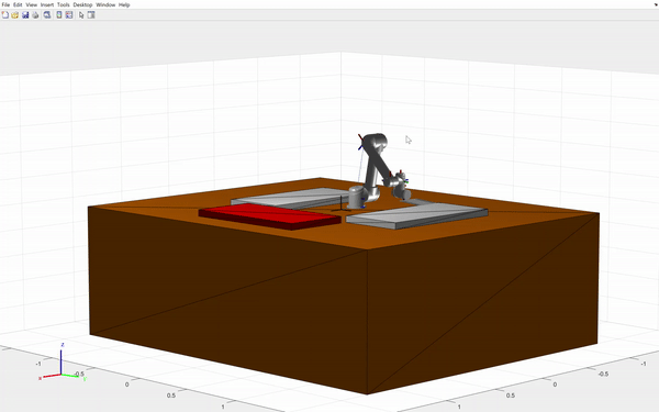 This was one of my Masters projects in robot kinematics and dynamics. The MatLab simulates a UR5 arm robot pickup and placing a burger onto a stove top (red). All joints are controlled via predetermined way-points in the path planning with the trapveltraj MatLab velocity profile function.